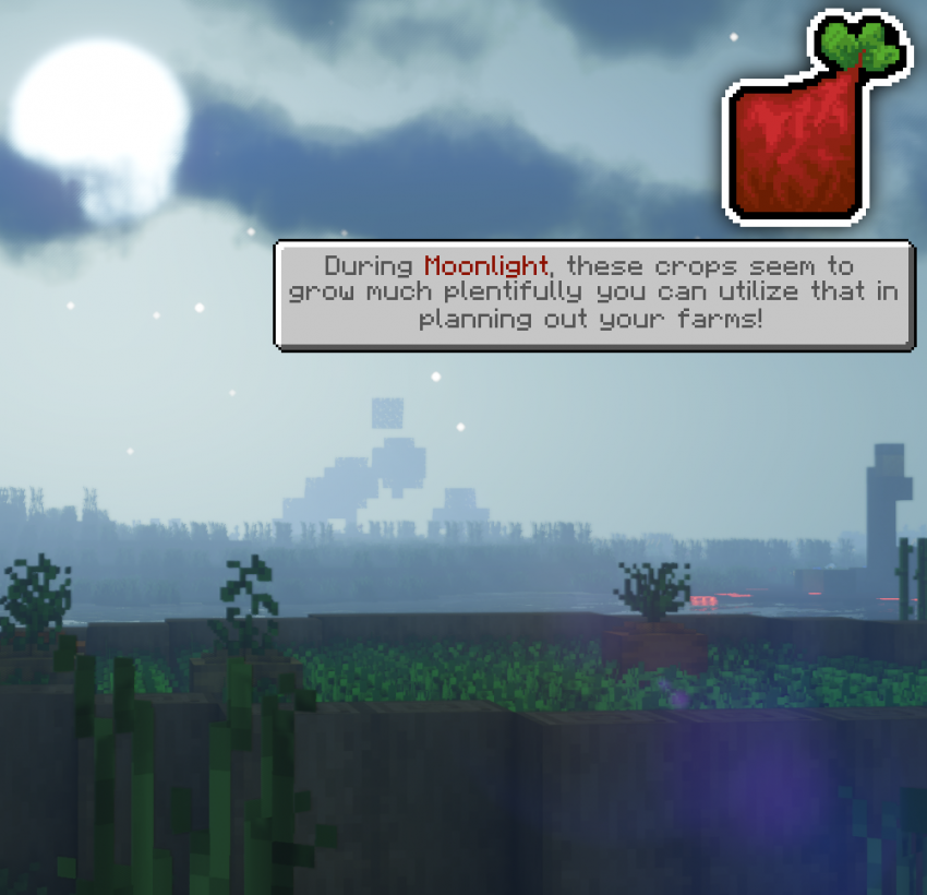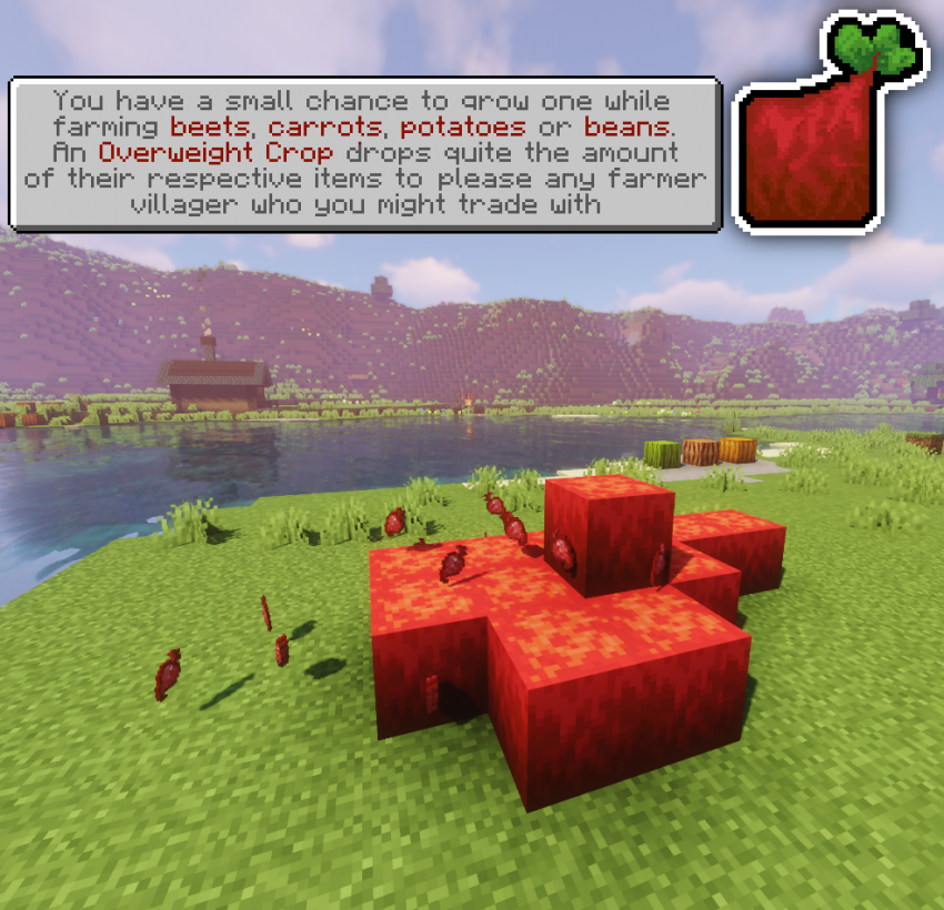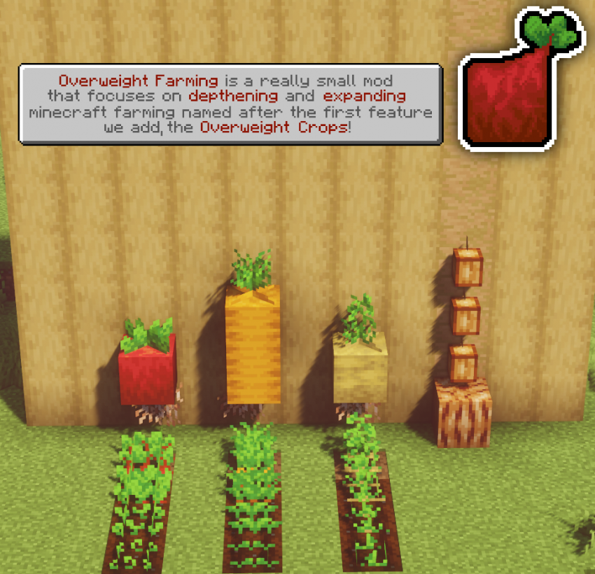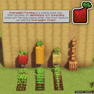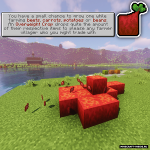 Мод Overweight Farming расширяет возможности ведения фермерского хозяйства в Майнкрафт. Вы сможете вырастить увеличенный посев, с которого можно получить больше урожая, чем при обычной культуре. При этом растения будут выглядеть как целые блоки свеклы или картофеля. В лесу могут попасться огромные яблоки на деревьях, а так же можно собрать много с какао-бобов и адских наростов.
