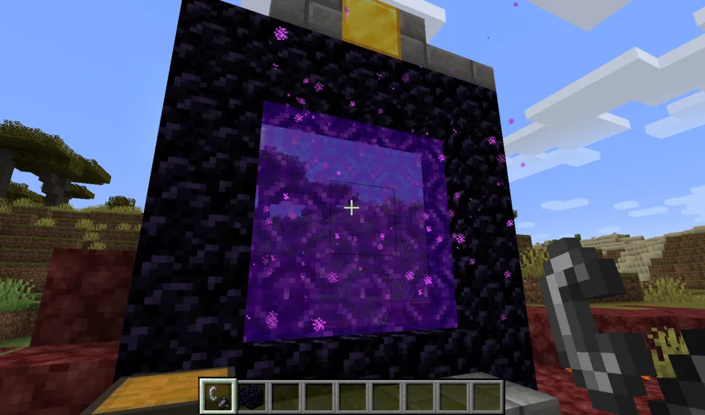 Вы появитесь на саванне прямо перед порталом в нижний мир. Главной его уникальностью является то, что его можно достроить и активировать используя рядом стоящий сундук. В нём есть обсидиан и огниво. Прямо под порталом есть заброшенная шахта и спавнер пауков.
