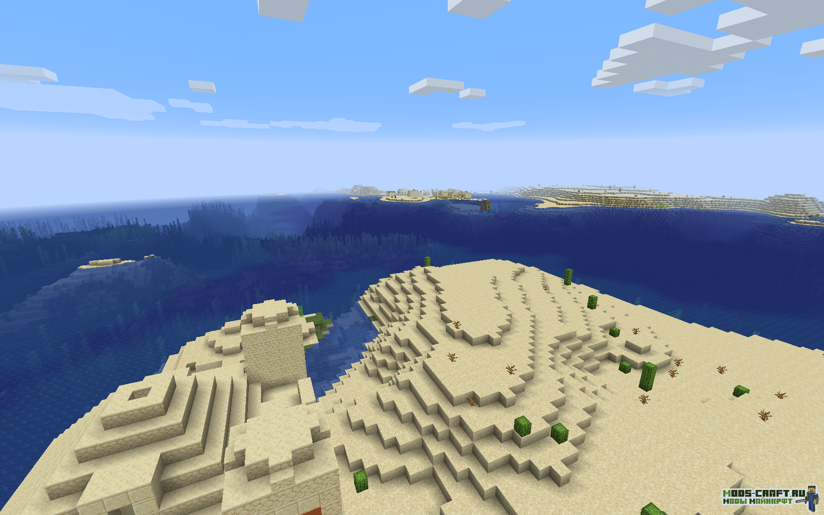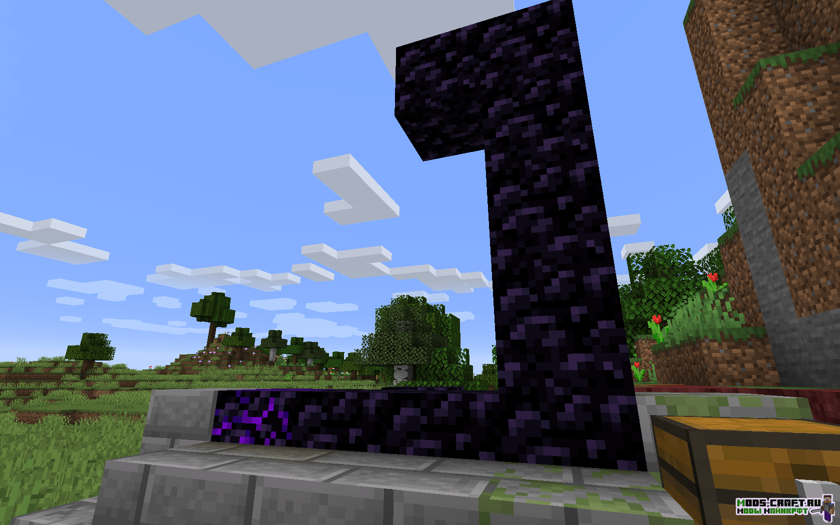 Вы появляетесь в лесу рядом с разрушенным порталом, рядом с ним есть сундук с хорошими предметами для стартового развития. Если последовать по координатам «-773, 65, 10«, то можно найти храм в пустыне и через реку будет деревня в пустыне.