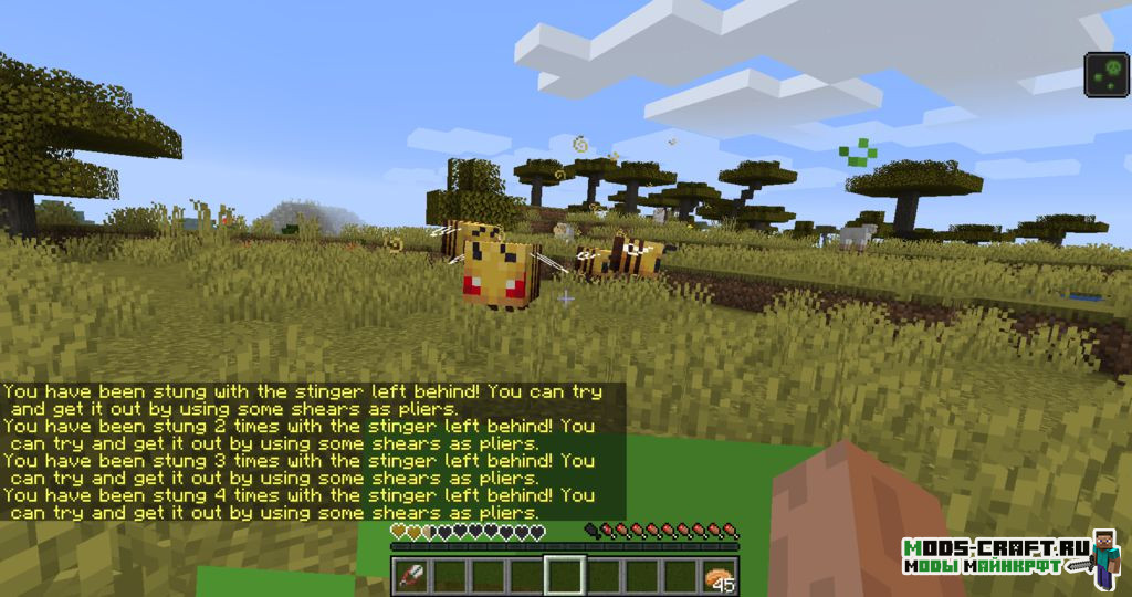 Данный мод изменяет пчёл в игре Майнкрафт, делая их более реалистичными в плане поведения и визуальной части. Теперь их размер будет составлять всего 25% от обычного. Всякий раз, когда пчела жалит игрока или любое существо, у нее есть шанс оставить свое жало в теле. Когда это произойдет, пчела застынет на месте и в скором времени погибнет. В реальной жизни жало не всегда остается после укуса пчелы. Когда это происходит, брюшко пчелы вынимается вместе с жалом — это смертельно для пчёл. Оставленное в теле жало будет наносить периодический урон жертве в течении 30 секунд, но игроку могут вытащить жало при помощи ножниц.