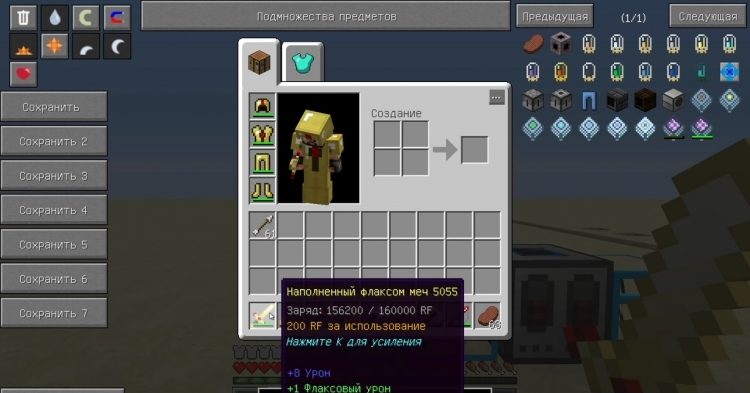 С помощью мода Redstone Arsenal можно добавить различные наборы оружия и инструментов с усиленным режимом работы, который нужно включить нажав k. Обратите внимание, что в это время они будут потреблять больше энергии, но в то же время наносить больше урона и быстрее разрушать блоки. Оружие можно потом зарядить.