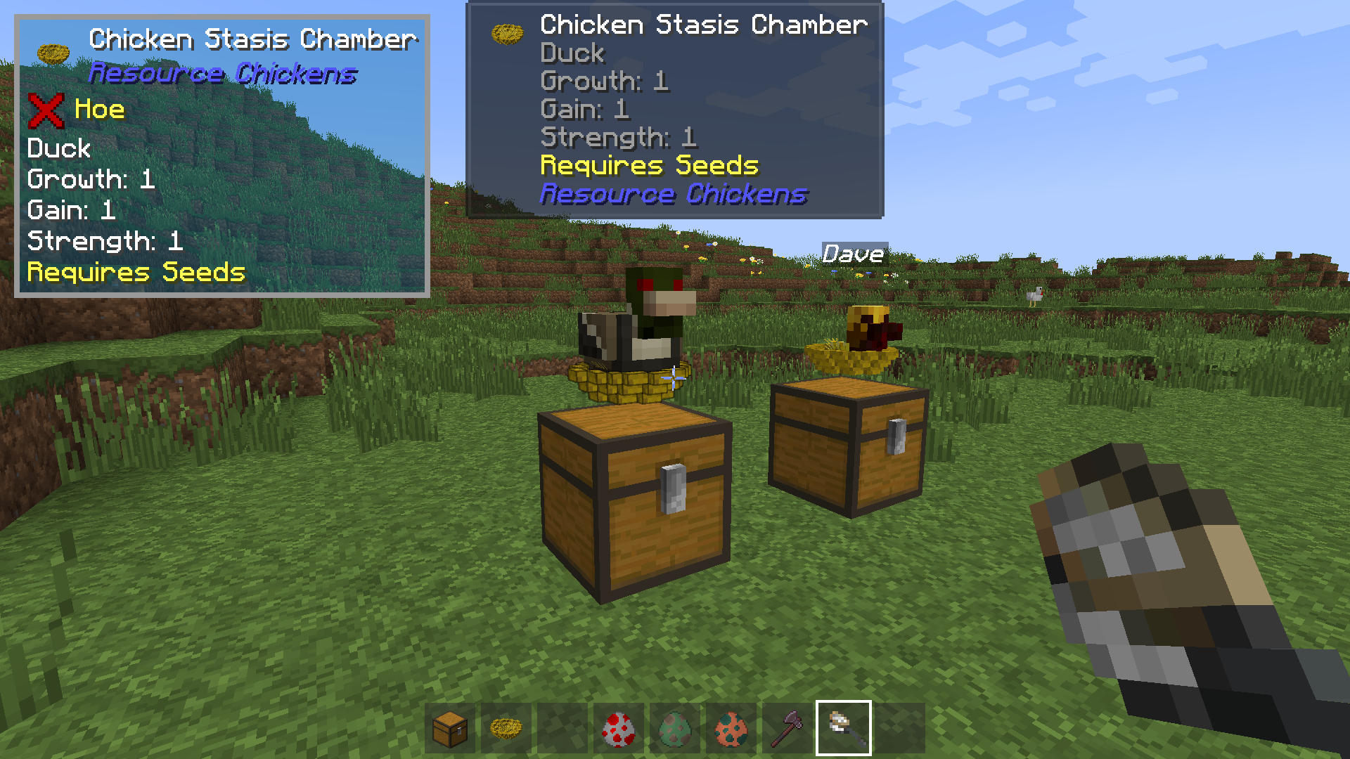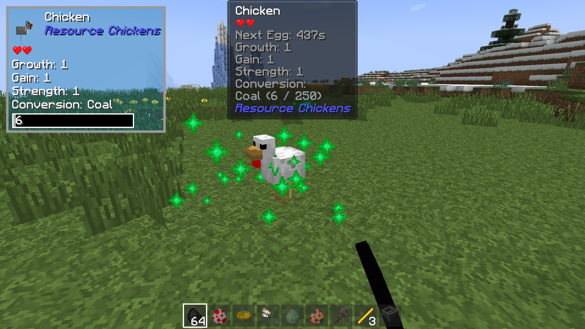 С модом Resource Chickens для упрощения добывания ресурсов в игре можно использовать куриц нужного типа. Их просто надо будет разводить и за это получать много этого вида ресурсов. Для того чтобы помочь поймать нужную птицу можно использовать сачок, а высиживать на специальном насесте, в котором должны быть обязательно семена для еды им (пшеница, дыня, тыква, свекла).
