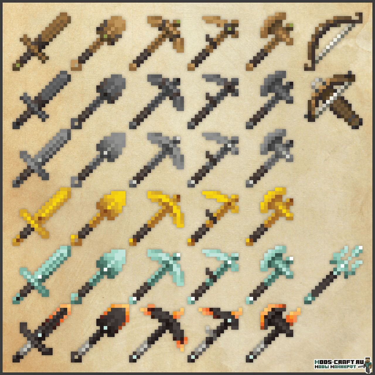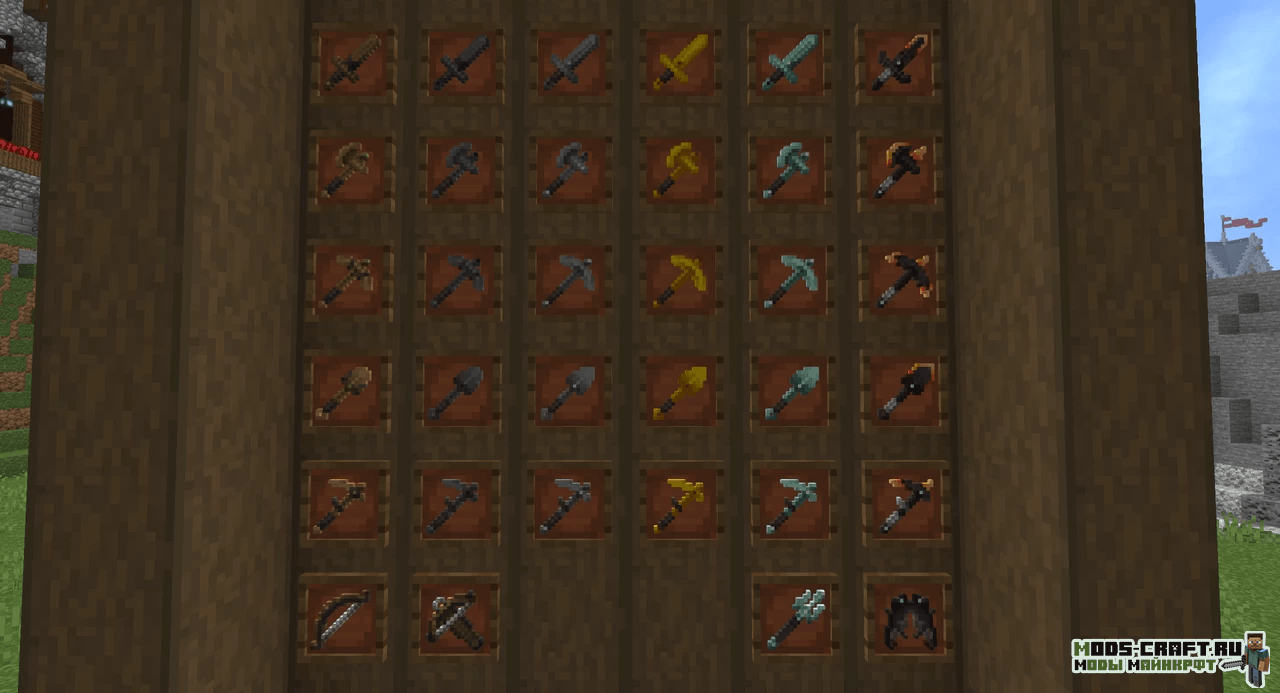 Ресурспак изменяет ванильные текстуры инструментов, оружия и брони на детализированные средневековые текстуры с уникальным взглядом автора.