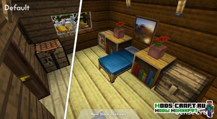 Интересный текстуры в мягком стиле не будут особо портить глаза излишним контрастом, а наоборот, добавит игре нечто более красивого и детализированного. В SenseCraft все текстуры окружения и блоков будут улучшены на основе стандартных текстур, чтобы не портить представление об оригинальном Minecraft.
