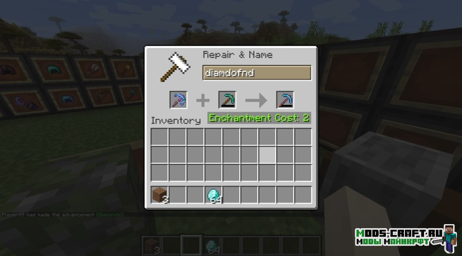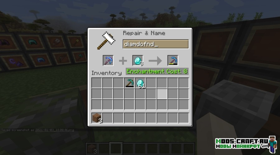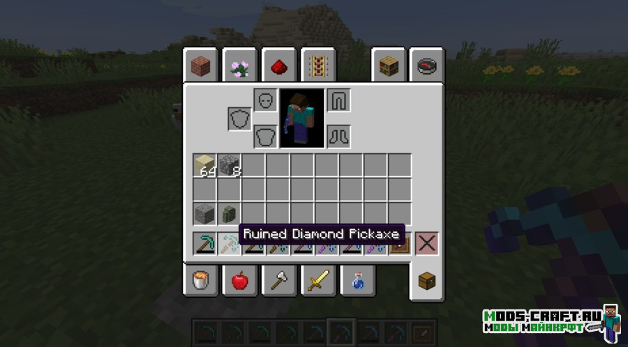 Мод Ruined Equipment изменяет механику поломанных вещей и теперь они не пропадают, а становятся разрушенными. Это позволяет владельцу отремонтировать их на наковальне наковальне или в верстаке, объединив два разрушенных предмета; либо просто сохранить себе на память. При достижении 0 значения прочности у брони, инструмента или оружия вы услышите характерный щелчок — это означает, что предмет сломался. У разрушенного предмета остаются чары, цвет и название.