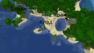 Вы появитесь на небольшом острове, где есть храм в пустыне и спрятанный клад. Рядом с островом есть много разбитых кораблей. Если проследовать через большую гору, то мы увидим деревню на равнине. Скриншоты: Инструкция по установке: Запустите игру; Нажать «Одиночная игра»; Выбрать «Создать новый мир» → «Настройки мира…»; В поле «Ключ для генератора мира» вставить -8269566626200230284; …