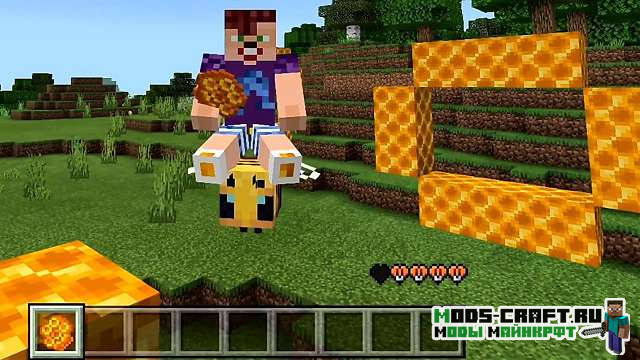- Мёд — аналог блока слизи, обладает свойствами притягивать к себе предметы, мобов и игроков. Создаётся из 4-х бутылок мёда;