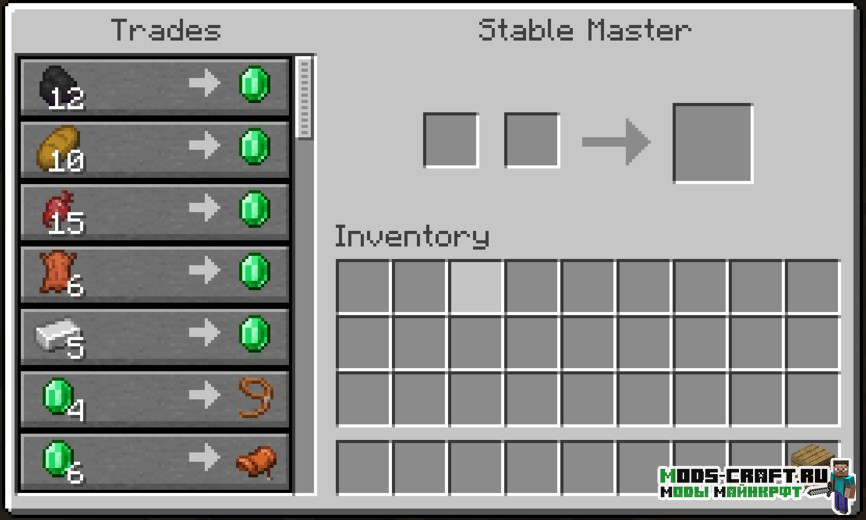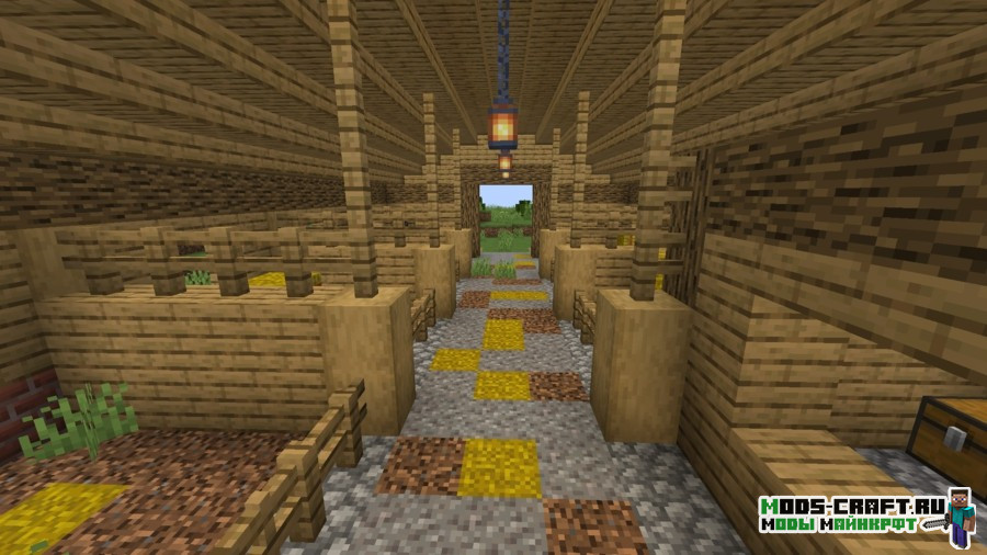Stables — это мод, добавляющий в генерацию равнинного биома верхнего мира новую структуру — конюшню. В ней вы можете получить связанные с лошадью предметы: сёдла, верёвку и броню лошадей. Для этого вам необходимо подойти к новому мобу — хозяину конюшни, он будет обменивать предметы на изумруды. Структура будет иметь несколько разных вариаций и обладать приятным внутренним интерьером, а также есть шанс появления там лошадей.