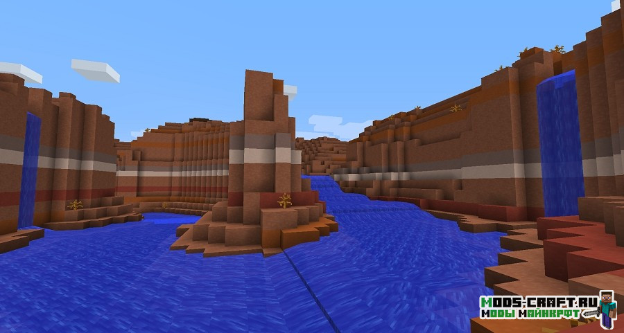 Streams добавляет реалистичные реки в Майнкрафт с плавным течением. Реки генерируются в мире с помощью пользовательских не разлагающихся текучих блоков и начинают свой путь из нескольких источников и текут вниз по местности через склоны и водопады, соединяясь вместе в более широкие реки, пока не достигнут моря или океана. Также в мире будут генерироваться подземные руки с туннелями, уходящие вглубь земли и большие каньоны с течением в пустыне. Чтобы лучше понять все замечательные изменения, смотри картинки и видео ниже.