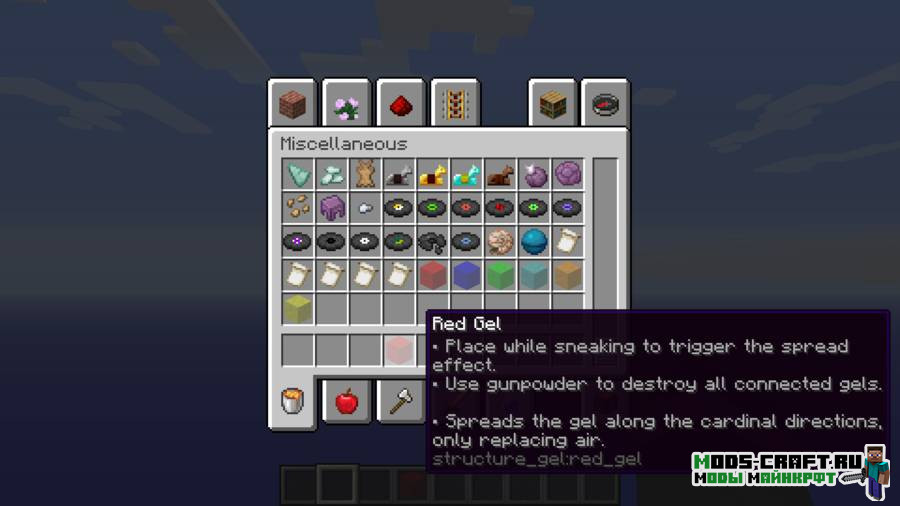 Structure Gel API — это мод-библиотека, предназначенный для облегчения создания структур разработчиками, особенно теми, кто использует систему jigsaw. Также он добавит специальный гелевый структурный блок нескольких видов, являющийся неплохим творческим инструментов для заполнения пустоты любых ваших построек без опаски, что она будет сгенерирована поверх рельефа. Для того, чтобы удалить гель используйте порох.