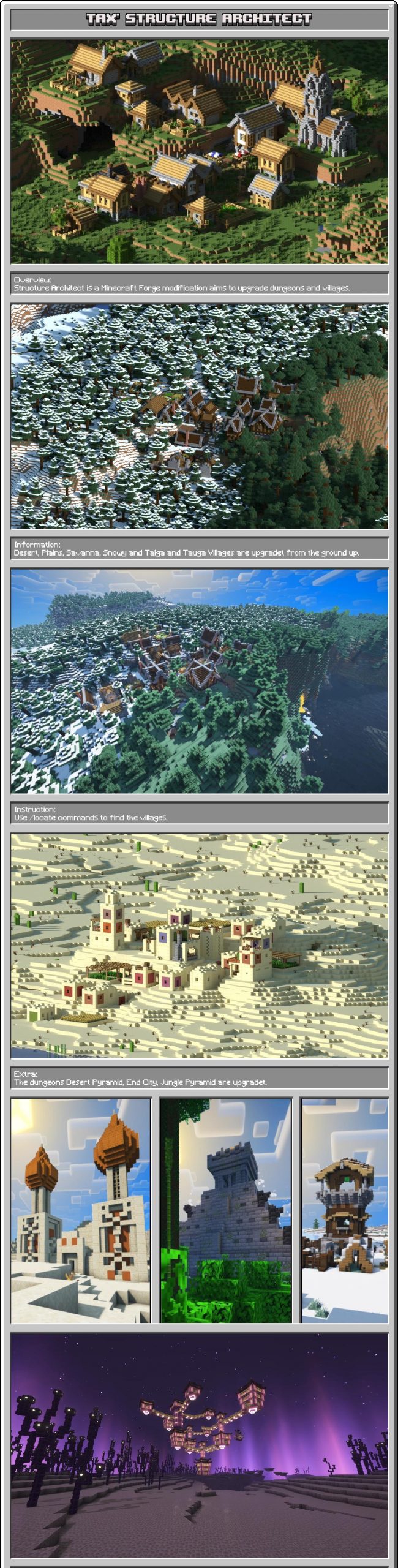 Модификация Tax’ Structure Architect предназначена для улучшения генерации данжей и деревень в Minecraft. Она придаст новый вид деревням, пустынным и джунглиевым храмам, аванпостам и городам края, сохраняя при этом основную стилистику этих построек.