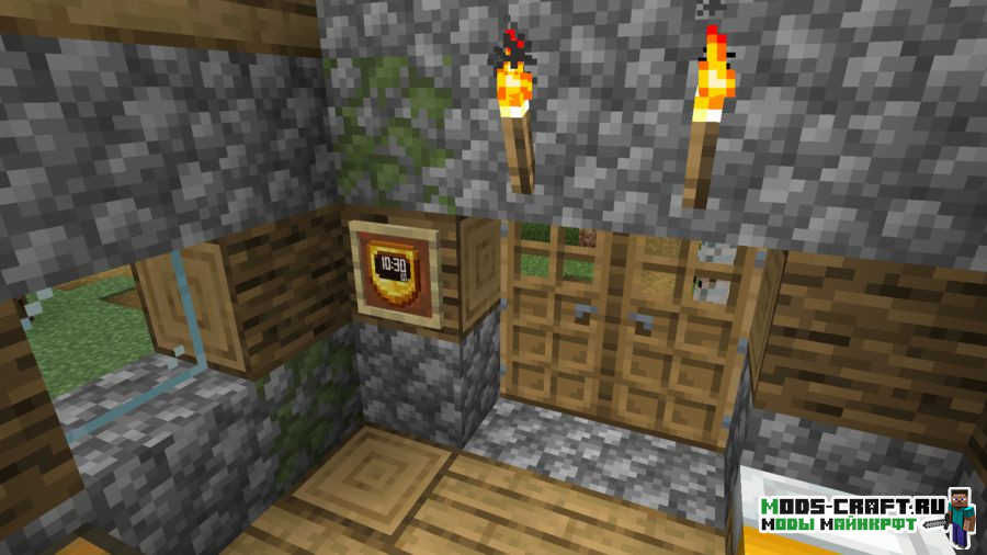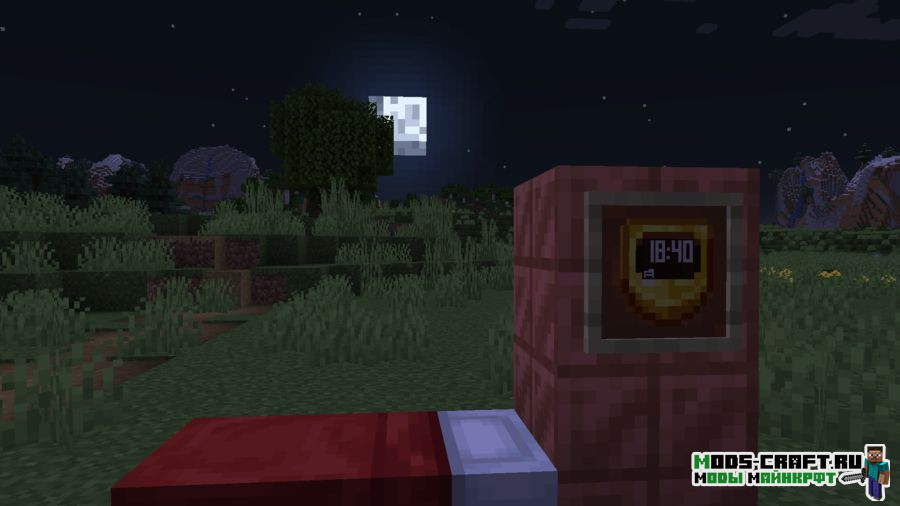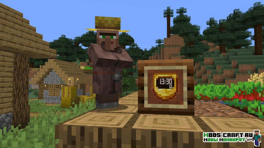 Данный текстур-пак добавляет цифровое табло времени на часы. Теперь вы будете знать точное время в игре. Во время сна будет показываться иконка кровати, а днём иконка работы.