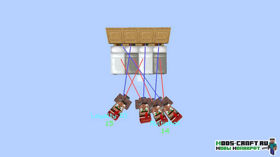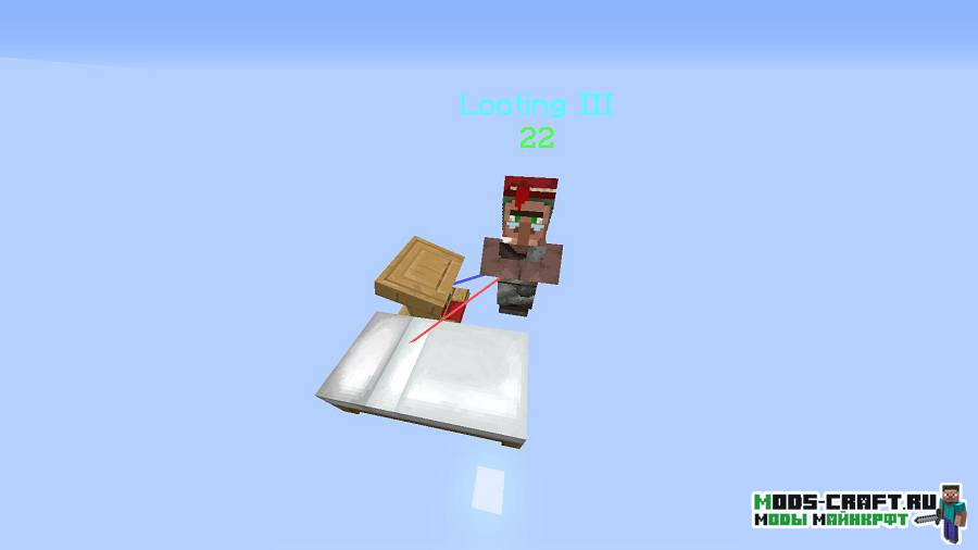 Мод VillagerHelper будет показывать дополнительную информацию о жителях деревни. Красной линией отобразиться отношение жителя кего кровати, синяя покажет профессию, а у торговца над головой будет показана информация про зачарование у первой проданной им книги.