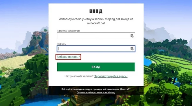 Смена пароля Майнкрафт на официальном сайте ничем не отличается от стандартного восстановления ключа через ссылку «Забыли пароль?». Нажав на нее, человек уже переходит на официальный сайт игры.
